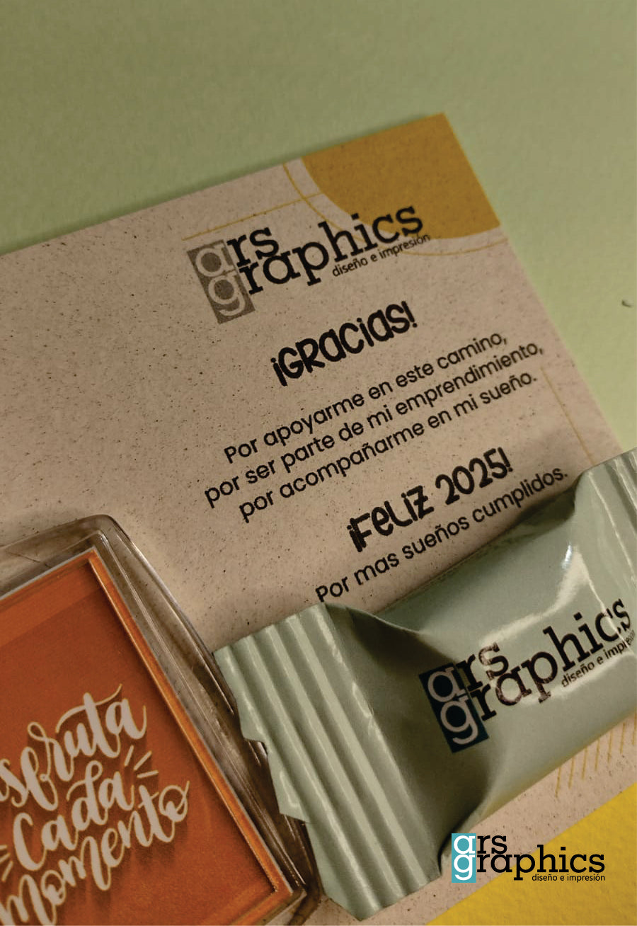 Tarjeta de 12x7 cm, llavero de acrílico personalizado en ambas caras y caramelo personalizado (Caramelos duros, frutales, de sabores surtidos)